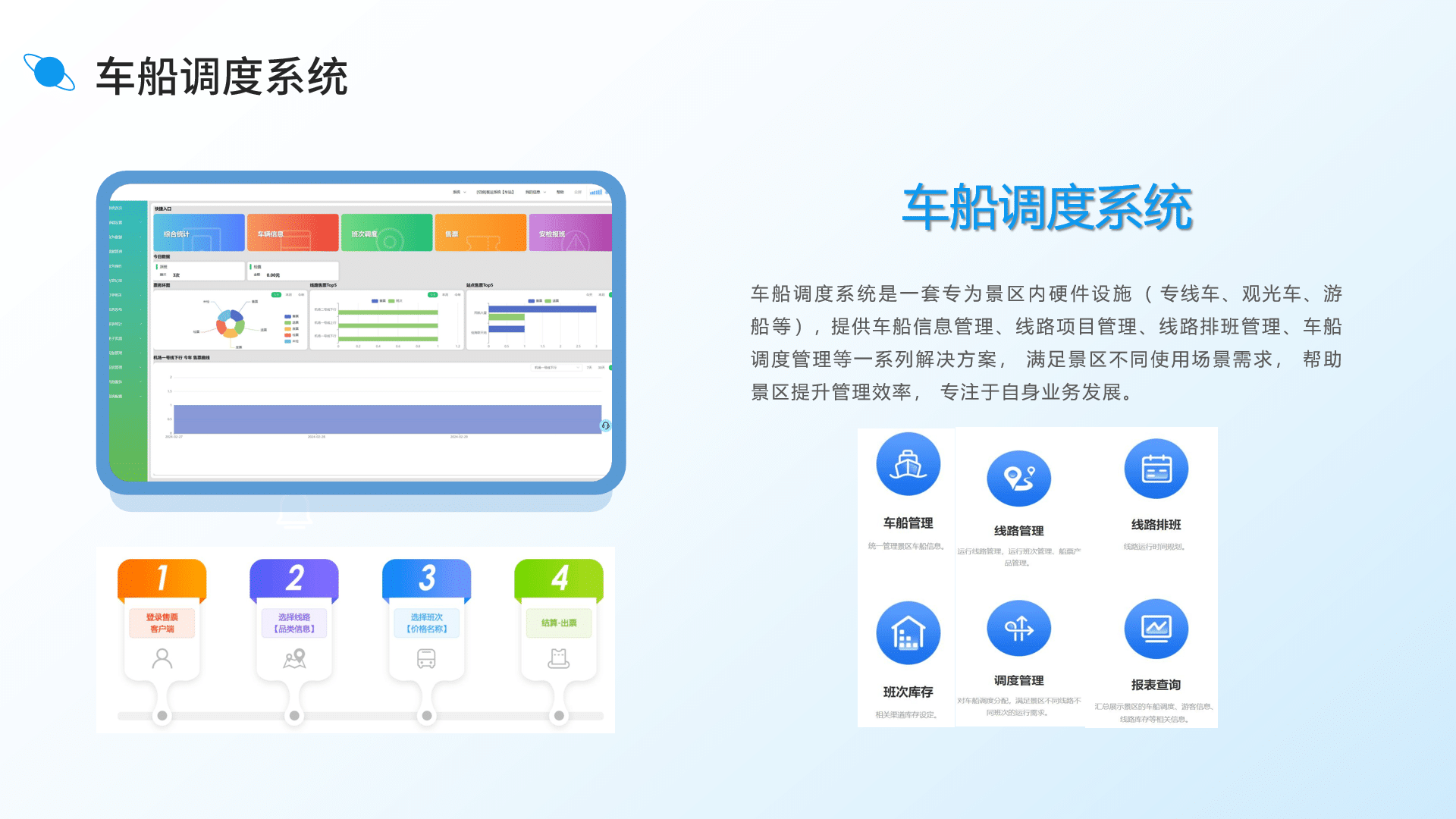 基于客流数据、车辆位置,系统智能调度车船(如加车、调整路线 );支持管理人员实时监控运行状态,异常情况(如拥堵、故障 )快速响应,保障游客运输流畅。