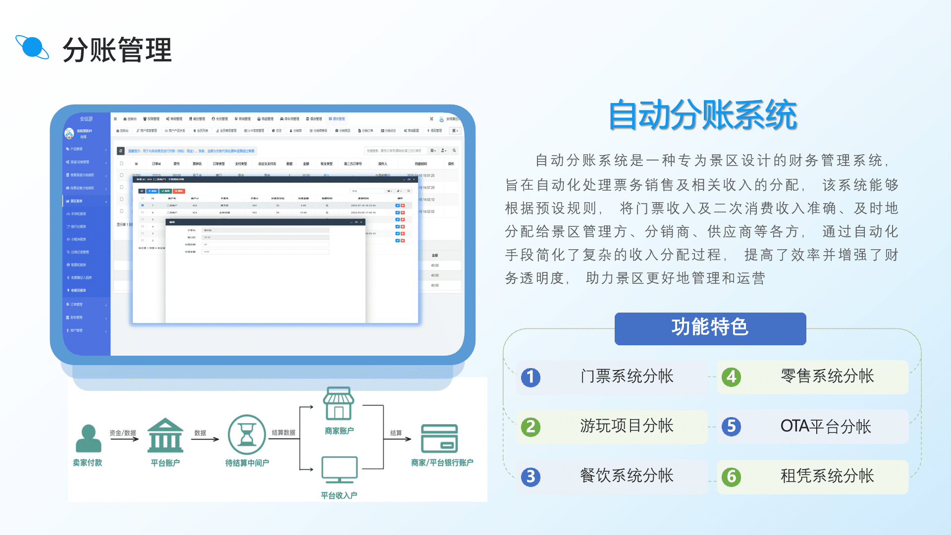 支持门票、游玩项目、餐饮、零售、OTA 平台、租赁等多业态分账,覆盖景区 “吃住行游购娱” 全消费场景,按预设规则精准分配各方收入,适配景区复杂业务生态。