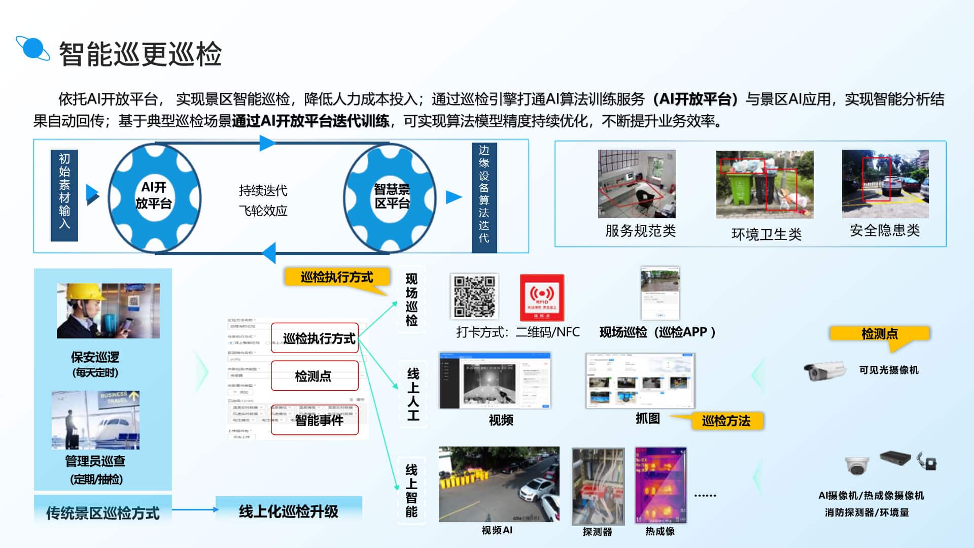 覆盖 “现场巡检(二维码 / NFC 打卡、APP 操作 )、线上人工(视频 / 抓图核查 )、线上智能(视频 AI、热成像等技术 )” 全模式,适配保安定时巡逻、管理员抽查等业务场景,灵活满足景区多样化巡检需求。